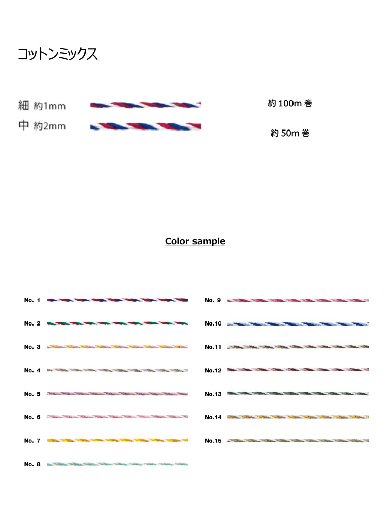 やわらかく扱いやすいコットン素材のミックスコード。ラッピングやハンドメイド、雑貨制作など幅広くご利用いただけます。